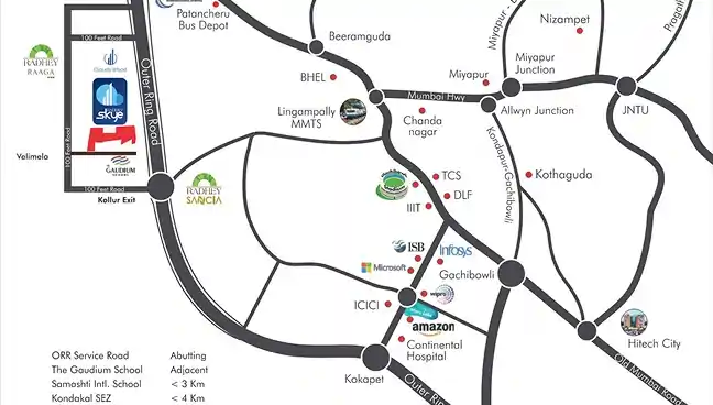 Radhey Skye is a TS RERA-approved residential project located in Velimela, abutting the Outer Ring Road (ORR) near the Kollur Exit-2. Developed by Clouds Wood Constructions Pvt.Ltd, this 10-acre development is conceptualized as a "Kids Centric Homes" designed to foster a tech-free, holistic environment for children's 360° development. The project consists of 7 towers with DS+ 23 floors, offering 1,419 units ranging from 2 BHK to 3.5 BHK apartments. The project features 150,000 sq. ft. of stilt amenities and a magnificent 50,000 sq. ft. grand clubhouse. Specialized outdoor features like a labyrinth, skating rink, and sensory walk.